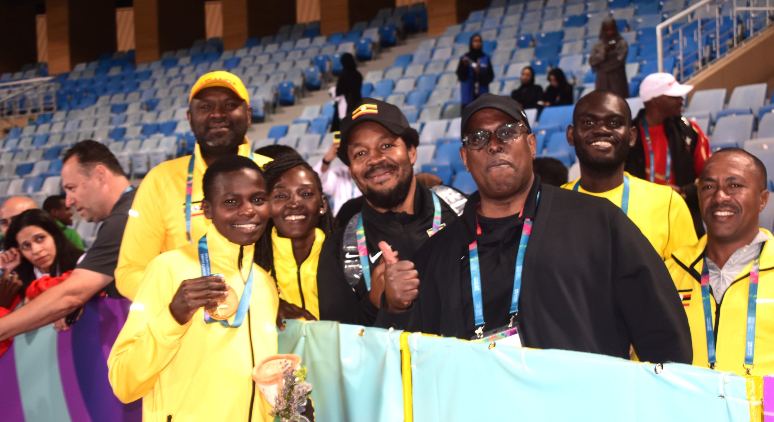 The handful of Uganda inside the Prince Faisal Bin Fahad Stadium passionately sang along as well as the lady of the moment, Rebecca Chelangat who had moments earlier sprinted to the finishing line to win the grueling women’s 10,000m race with a time of 32:11:42.
